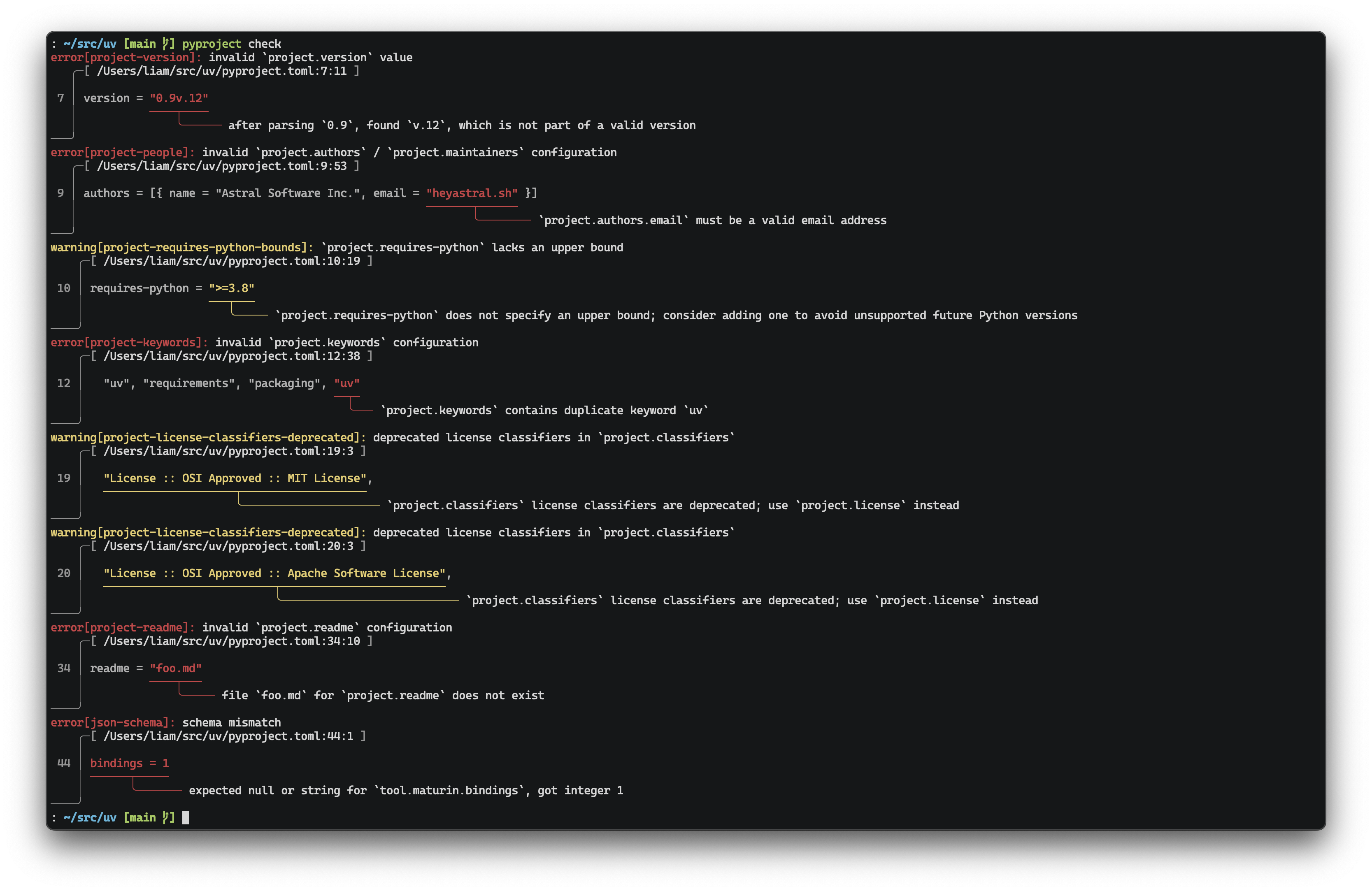 pyproject is a linter and language server for pyproject.toml files. I wrote this after encountering inconsistencies in build tool error reporting (e.g. some tools will let you ship empty licenses directories). I thought it would be nice to have a single source of truth for PEP 621 related checks and beyond that can run prior to running more expensive workflows. There are currently over 30+ rules that cover syntax validation, schema compliance, project metadata (i.e. name, version, description, etc), dependencies (i.e. PEP 508 format, version bounds, deprecations, updates), and lots more. The rule system is designed to be easily extended with custom rules to fit any projects specific needs. |