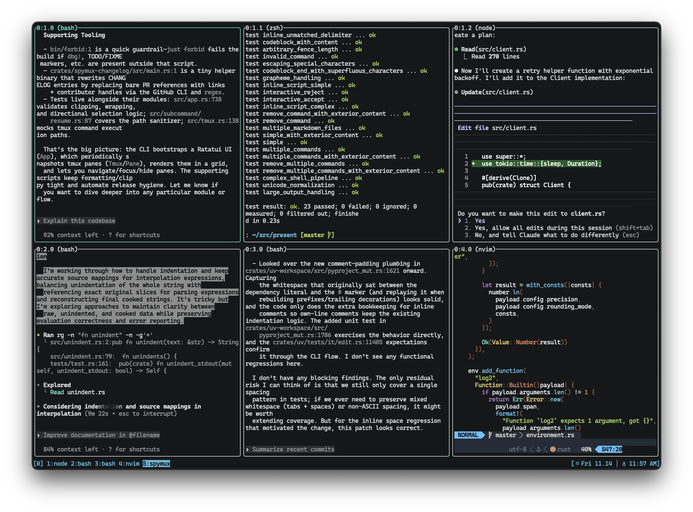spymux is a terminal user-interface for simultaneously watching all of your open tmux panes. I pair program a fair amount with tools like codex, and I run them in different projects (windows) at the same time. So I built this tool to give me a clear view into what the agents are doing, without having to switch between them. |