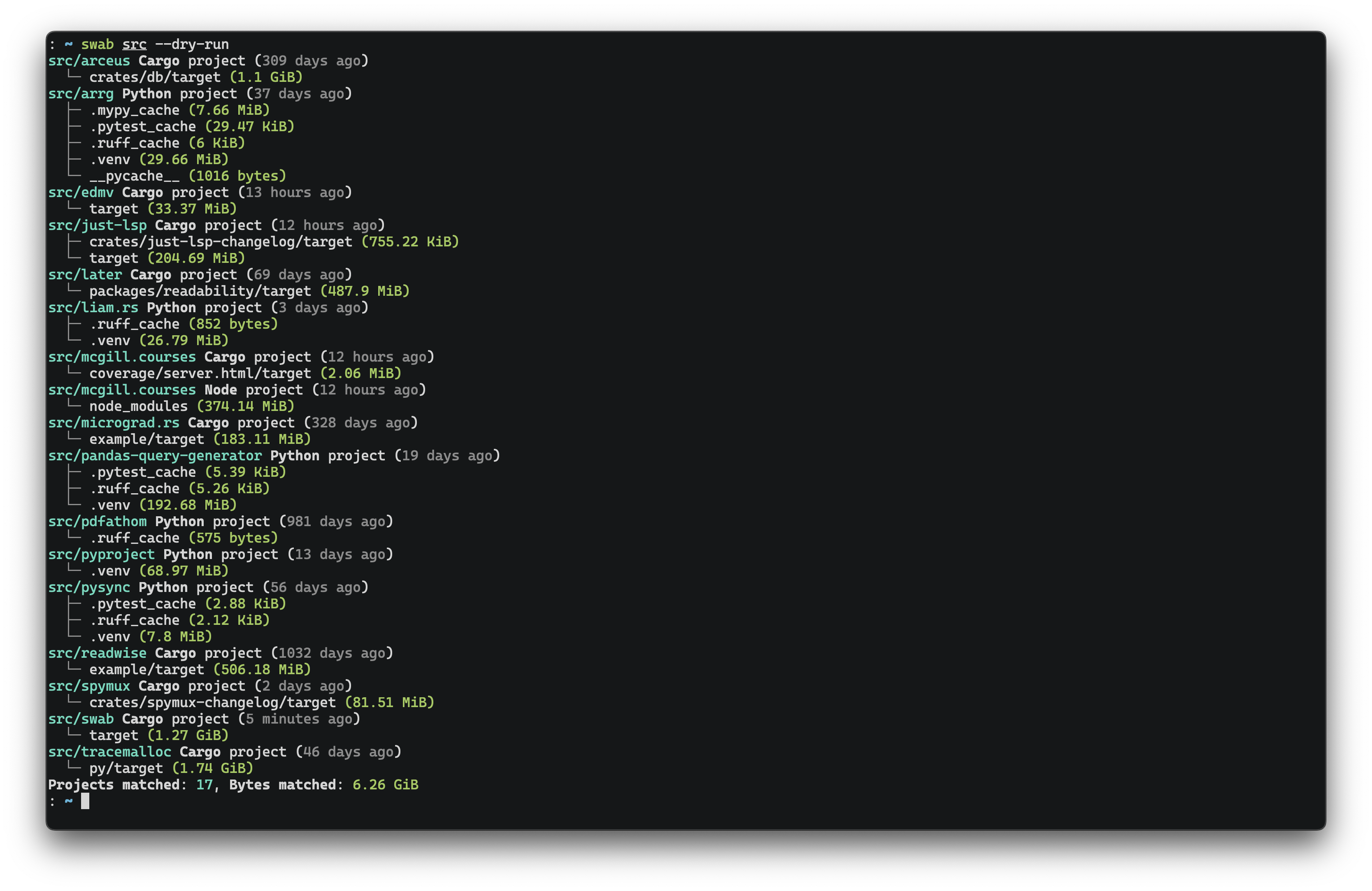 swab is a configurable project cleaning tool. I wrote this because other similar projects either weren’t configurable enough (didn’t allow adding custom rules without submitting a PR) or flexible enough (no glob support) to fit some of my use cases. The tool is very simple at its core, providing users with a set of default rules and the building blocks to override them or create new ones. |